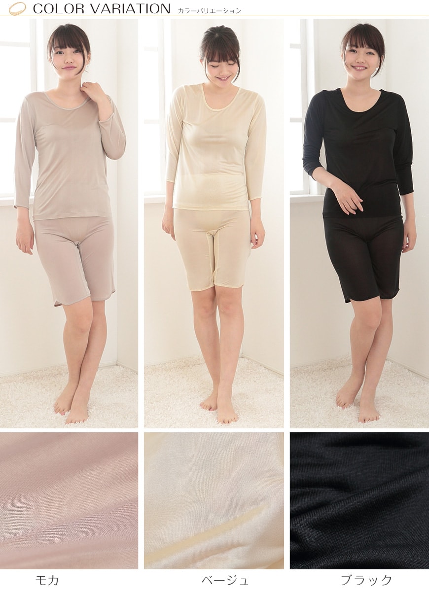 シルクを筒状に編み上げた生地を使用しているので、脇に縫い目がなくアウターに響きません。下着の透け対策にもおすすめです。