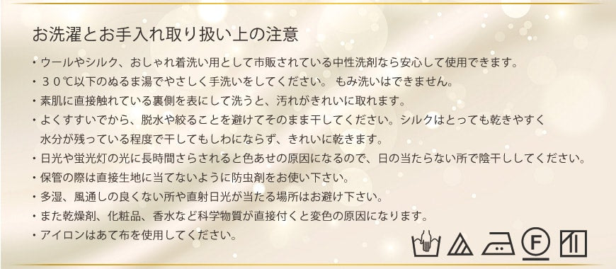 ※絹は天然繊維の性質上、お洗濯の際に伸びたり縮んだりする可能性がございます。