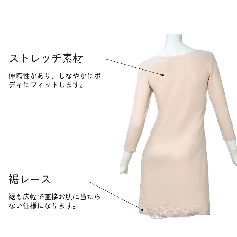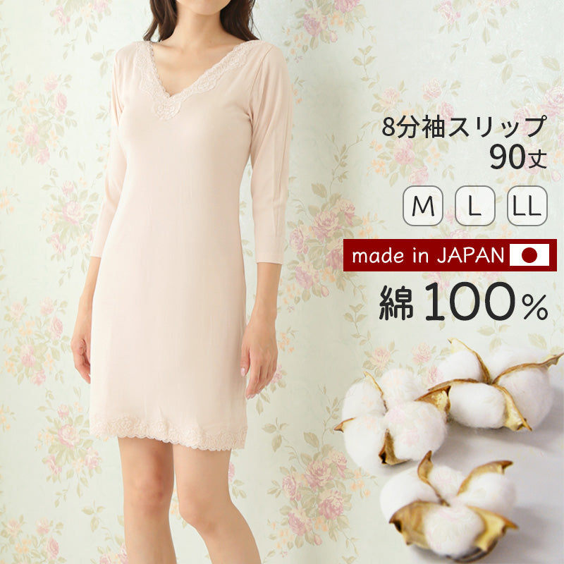 8分袖 スリップ 長袖 90cm丈 綿100 ランジェリー M~LL