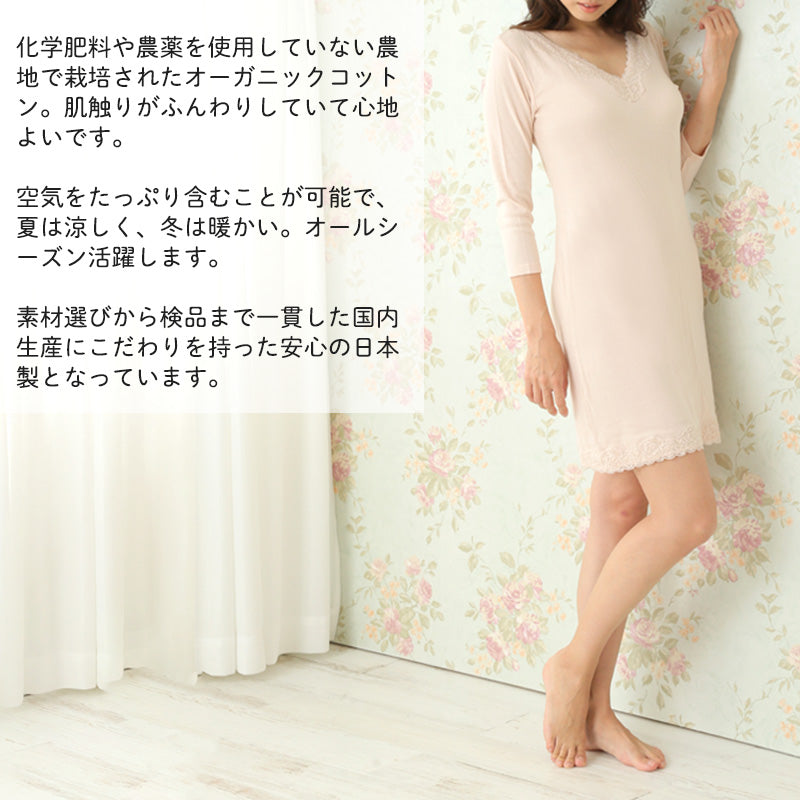 8分袖 スリップ 長袖 90cm丈 綿100 ランジェリー M~LL ワンピース インナー ロング 長い丈 日本製 綿100% 浴衣 下着 胸元レース エレガント 大きいサイズ M L LL (在庫限り)